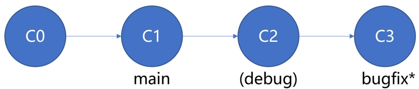 2. 【git】程序组遇到了一个棘手的bug,为了调试在代码中添加了一些调试语句,并且存在于bugFix分支的提交记录中。终于,这个bug被解决了,此时需要把bugFix分支合并回main分支,请选择你认为尽可能好的方式(例如,你可以选择直接合并,但是会导致main分支被调试语句污染),写出需要的命令。(C0,C1代表md5值,*为当前所在分支)
